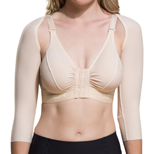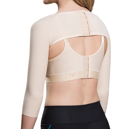 Þrýstingsermarnar ná niður að úlnlið. Kræktar saman á baki með þrjár stillingar á krækjum.