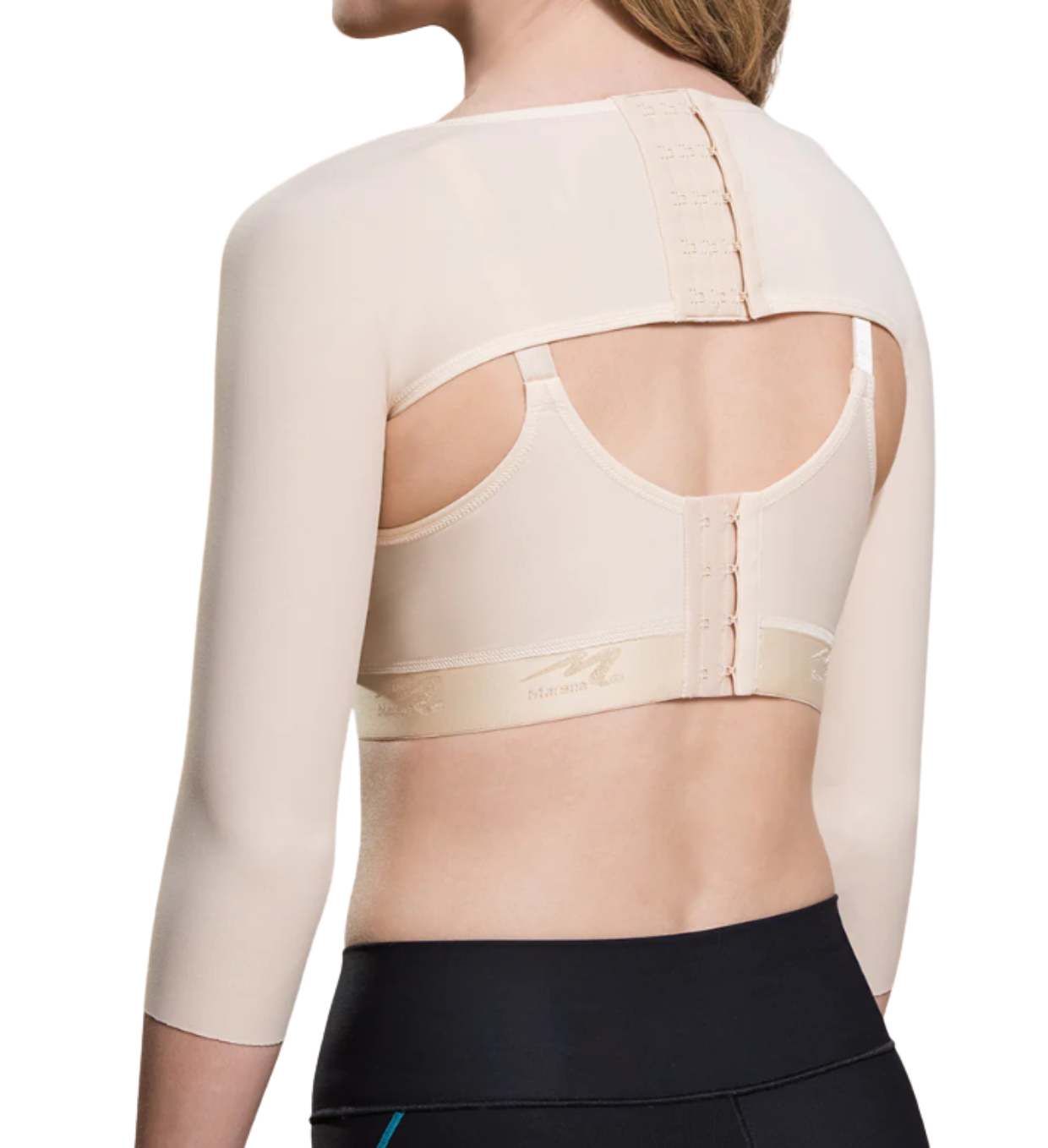 Þrýstingsermarnar ná niður að úlnlið. Kræktar saman á baki með þrjár stillingar á krækjum.