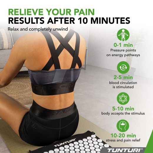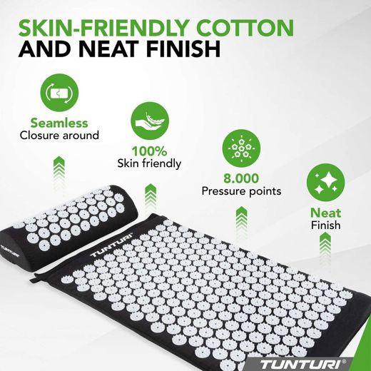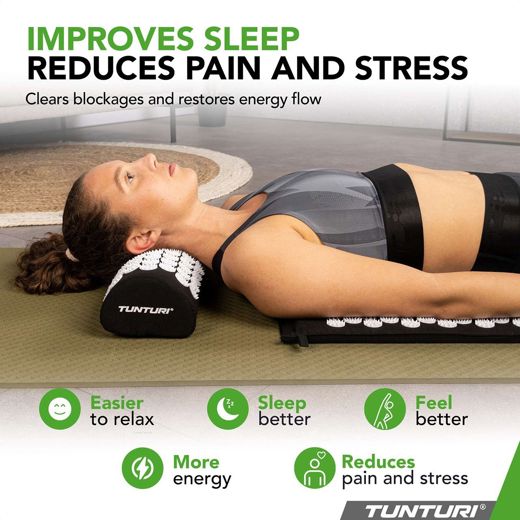 Tunturi nálamotta og púði. Með reglulegri notkun geturðu slakað betur á, haft meiri orku, sofið betur, dregið úr vöðvaverkjum og liðið betur í húðinni.